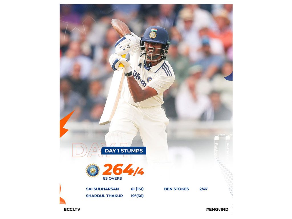 On the first day of the fourth Test match of the Anderson-Tendulkar Trophy 2025, played at Old Trafford in Manchester, India posted a formidable total of 264/4. The team was led by strong performances from left-handed batters Sai Sudarshan and Yashasvi Jaiswal, who both scored half-centuries to set the foundation for a solid innings.